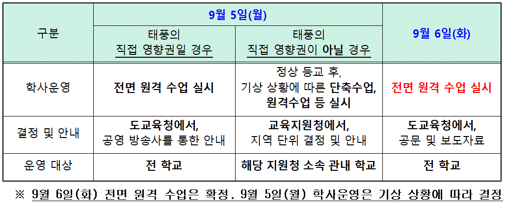 [제11호 태풍 힌남노 북상에 따른 안내] 학부모님 안녕하십니까? 태풍 북상에 따라 우리 지역에 강한 바람과 많은 비가 예상됩니다. 학교에서는 시설 안전점검하고 학생들의 안전한 등하교길을 위해 보다 주의하도록 하겠습니다. 9월 6일(화) 전면 원격수업은 확정, 9월 5일(월) 학사운영은 기상상황에 따라 결정하도록 하겠습니다. 9월 5일(월)은 태풍의 직접 영향권일 경우 필요시 도교육청에서 공영 방송사를 통한 안내를 하도록 하고, 태풍의 직접 영향권이 아닐 경우 정상 등교 후 단축수업 등을 고려하여 실시하겠습니다. 9월 6일(화)은 경상남도 전학교 전면 원격 수업을 실시함을 알려 드립니다. 학부모님께서는 안전한 학교생활이 되도록 불필요한 외출을 자제하고 기상정보에 관심을 가져 주시기 바랍니다. -원평초등학교장-