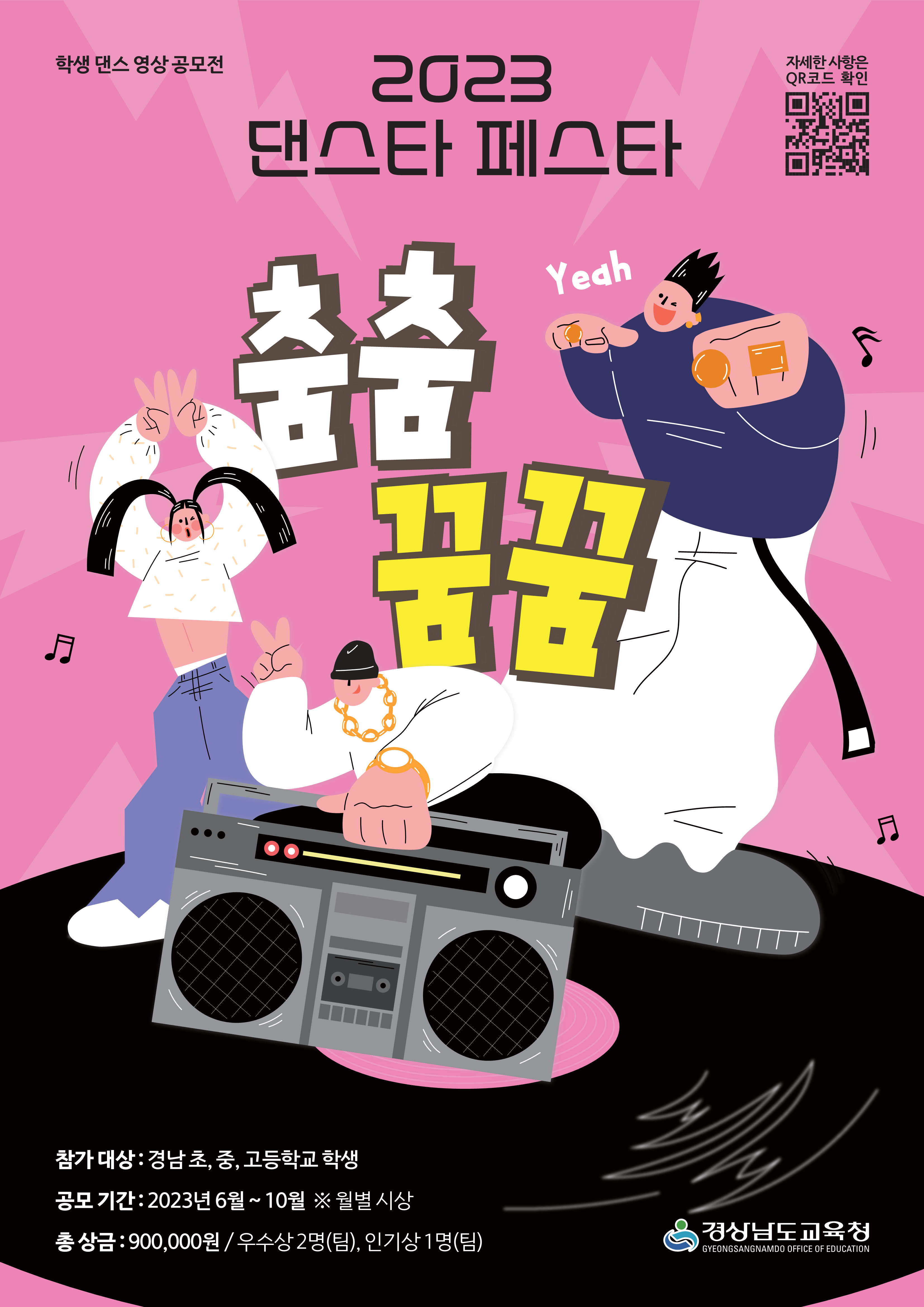 가. 명칭: 2023. 댄스타 페스타 춤춤꿈꿈 나. 기간: 6월~10월 (월별 우수자 3명 상금 지급) 다. 대상: 초등학생, 중학생, 고등학생 라. 상금: 월별 우수 팀당(3팀) 300,000원 마. 세부내용: 붙임파일 참조 바. 접수일자 변경 2차: 7월1일(토) ~ 7월23일(일) 3차: 8월1일(화) ~ 8월20일(일) 4차: 9월1일(금) ~ 9월17일(일) 5차: 10월1일(일) ~ 10월22일(일)