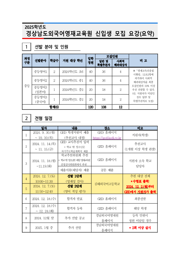 2025학년도 경상남도외국어영재교육원 신입생 선발 계획 안내