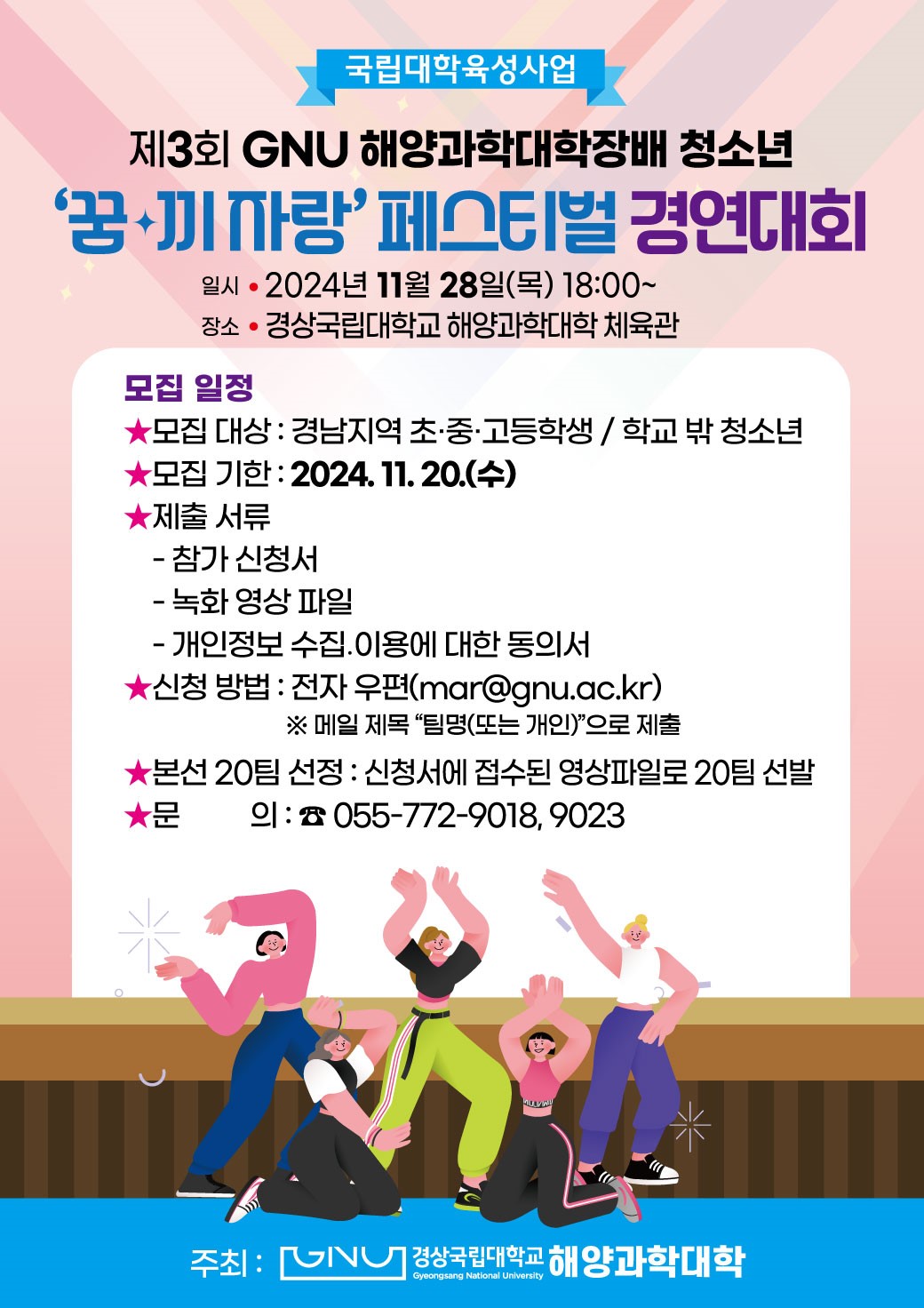 구 분 | 「제3회 GNU 해양과학대학장배 ‘꿈·끼 자랑’페스티벌 경연 대회」 | 일 정 | 2024. 11. 28.(목) 18:00 | 장 소 | 경상국립대학교 해양과학대학 체육관 | 참가 대상 | 경남 초·중·고등학생 / 학교 밖 청소년 | 참가 분야 | 댄스, 노래, 연주 등 | 시 상 (리플릿 참조) | 구분 | 상금 | 대상 (1팀) | 100만원 | 최우수상 (1팀) | 70만원 | 우수상 (2팀) | 50만원 | 인기상 (2팀) | 30만원 | 신청 기한 | 2024. 11. 20.(수) | 신청 방법 | 전자우편 신청(mar@gnu.ac.kr) ※ [붙임]안내문 참조 |