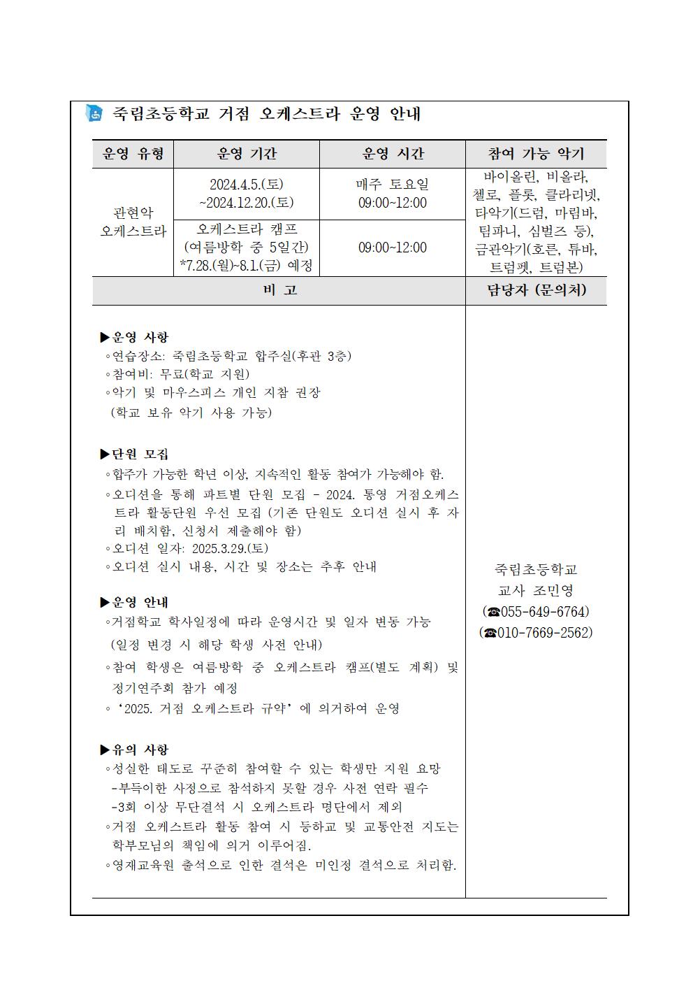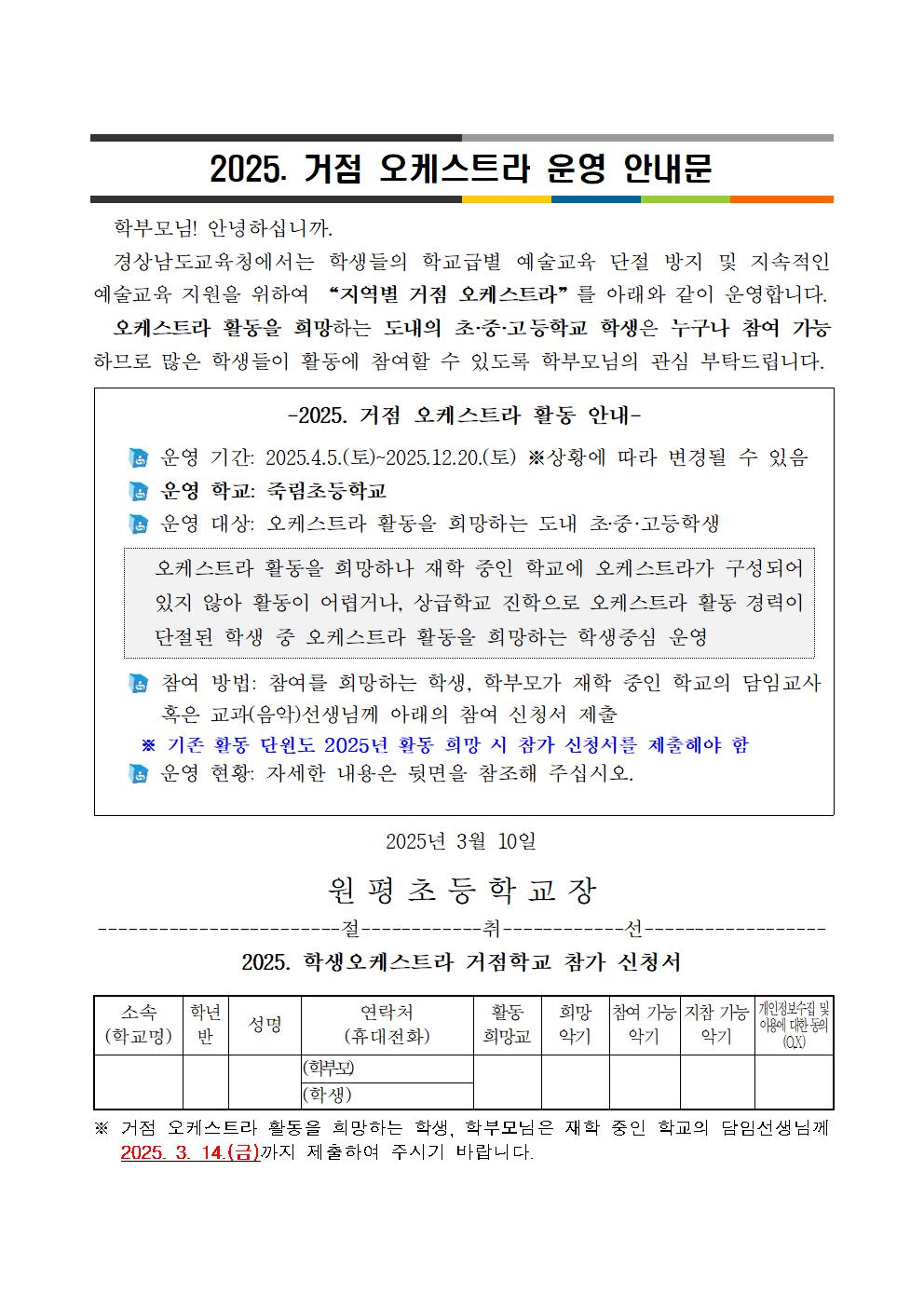 2025. 거점 오케스트라 참가 신청을 희망하는 분은 신청하시기 바랍니다. 통영은 죽림초등학교에서 실시합니다. 프린트해서 작성 후 담임 선생님께 제출해주시기 바랍니다.