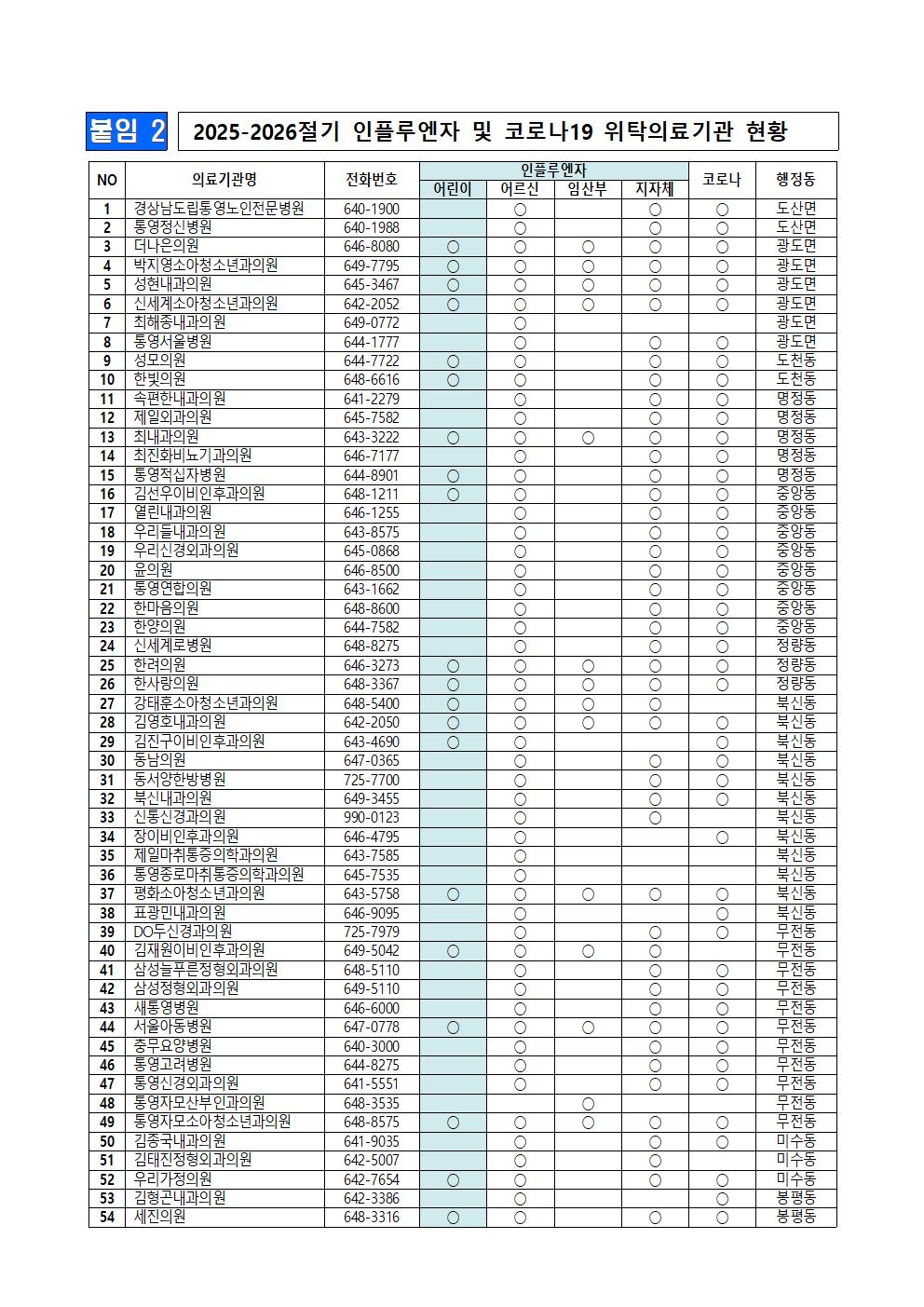 < 2025-2026절기 어린이 인플루엔자 국가예방접종 지원사업 > ○ 접종대상:생후6개월~13세어린이(2012.1.1.~2025.8.31.출생자) ○ 접종기간 * 2회 접종대상: 2025.9.22.~2026.4.30. (*생후6개월~9세미만 아동 중 접종력이 없는 경우) * 1회 접종대상: 2025.9.29.~2026.4.30. ○ 접종장소: 보건(지)소, 보건진료소, 위탁의료기관 20개소(첨부파일 참조) ○ 문의사항: 통영시보건소 예방접종실(☎ 650-6085~7)